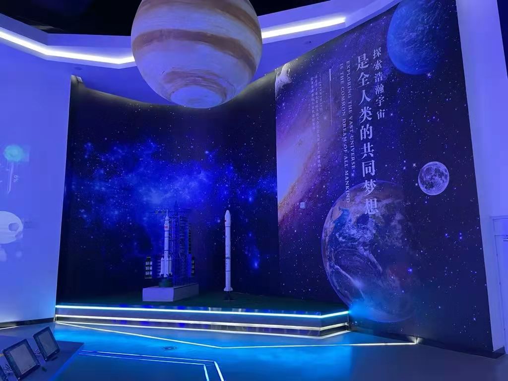 展厅宽敞明亮,配备超大高清LED屏幕,可同时容纳200人,主要为人数较多的体验团体而设置。在此展区还建有一个裸眼3D深空环幕剧场,无需借助其他设备,抬起头便仿佛置身浩瀚宇宙,真正感受到“手可摘星辰”,开启对深空宇宙无穷奥秘的探索。